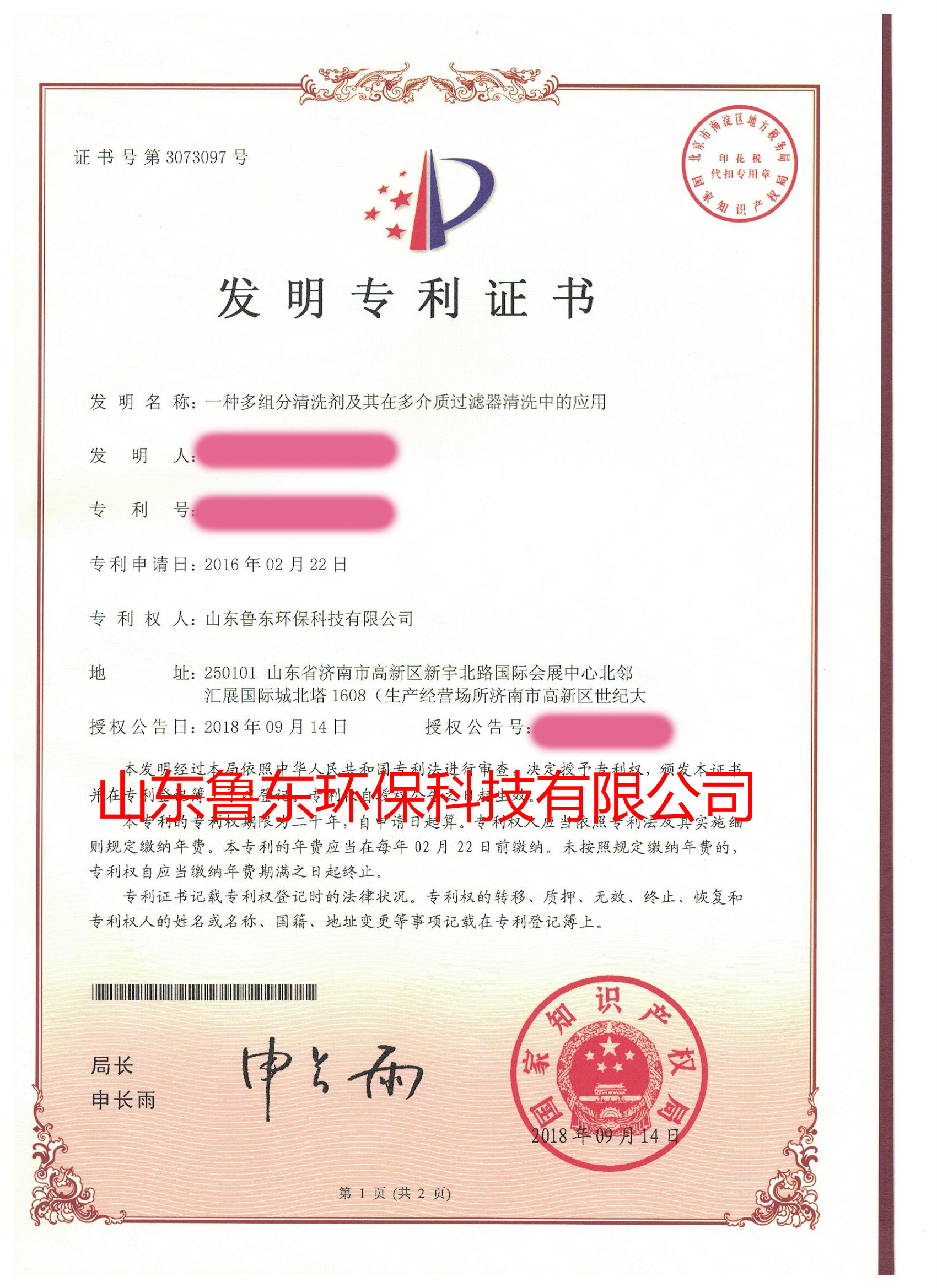 該專利為山東魯東環(huán)保科技有限公司技術(shù)研發(fā)團隊自主研發(fā)的成果,體現(xiàn)了公司在水處理藥劑行業(yè)創(chuàng)新能力進一步提高,更體現(xiàn)了公司一直以來對水處理藥劑品質(zhì)的不斷追求。