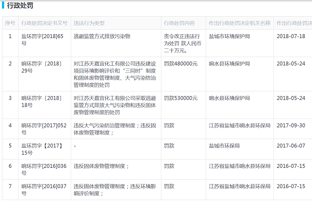 經(jīng)啟信寶查詢,2018年5月24日,天嘉宜化工被響水縣環(huán)境保護局處罰,[響環(huán)罰字〔2018〕29號]決定文書介紹,依據(jù)《建設(shè)項目環(huán)境保護管理條例》第二十三條、《中華人民共和國環(huán)境影響評價法》第三十一條、《中華人民共和國大氣污染防治法》第一百零七條、《中華人民共和國固體廢物污染環(huán)境防治法》第七十五條,天嘉宜化工被罰款480000元。最近的一次是2018年7月18日,因逃避監(jiān)管方式排放污染物,被鹽城市環(huán)境保護局責令改正違法行為,并處罰款人民幣20萬元。