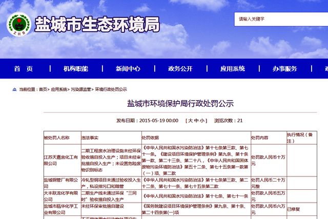 鹽城市環(huán)境保護局2015年5月19日公布的行政處罰公示顯示,江蘇天嘉宜化工有限公司二期工程廢水治理設(shè)施未經(jīng)環(huán)保驗收擅自投入生產(chǎn);未設(shè)置危險廢物識別標志,處罰款人民幣10萬元。